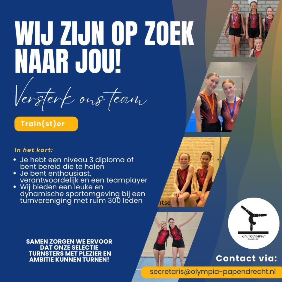 Ben jij gepassioneerd over turnen en wil je jouw kennis en enthousiasme delen met jonge talenten? Olympia is op zoek naar een gemotiveerde en enthousiaste trainer die ons team wil versterken!